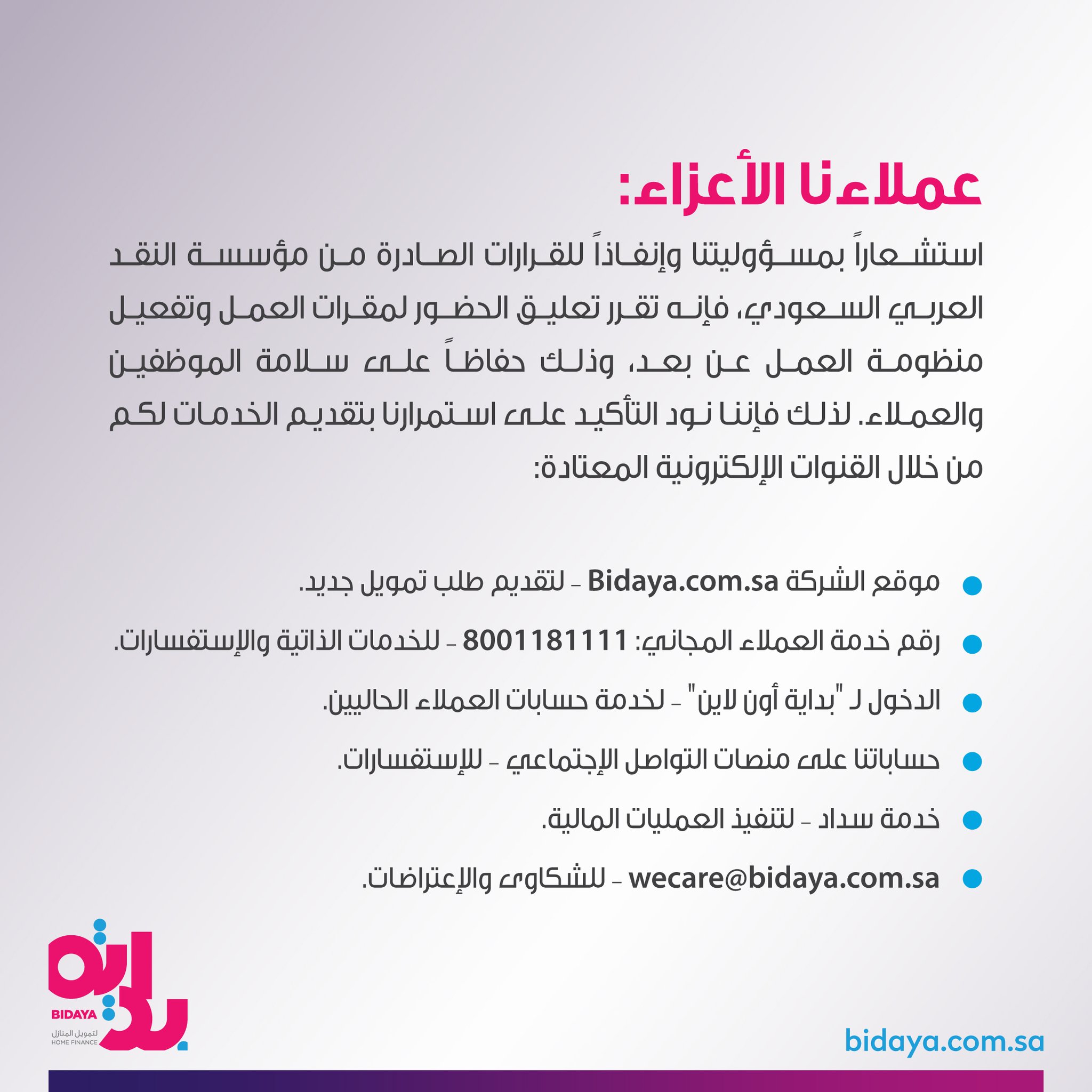 بداية لتمويل المنازل On Twitter من منطلق الجهود الحثيثة التي تبذلها حكومة المملكة وحرصا على سلامتكم وراحتكم فبإمكانكم استخدام قنواتنا الإلكترونية من أي مكان على مدار الساعة وطوال أيام الأسبوع Sama Gov Mhrsd Sa