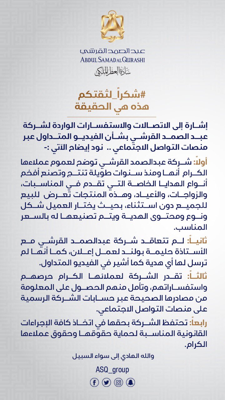 د ملاك الحســيني Na Twitteru عبدالصمد القرشي يسيئ للإناث لم تتعاقد شركة عبدالصمد القرشي مع الاستاذة حليمة بولند لعمل اعلان كما انها لم ترسل لها ا ي هدية كما أشير بالفيديو المتداول وتحتفظ الشركة بحقها في