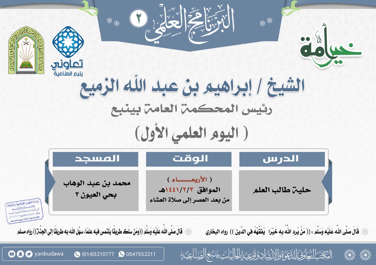 دعوة ينبع الصناعية على تويتر سيقام اليوم العلمي بعنوان حلية طالب العلم لفضيلة الشيخ إبراهيم الزميع وذلك بعد صلاة العصر إلى صلاة العشاء بمسجد الشيخ محمد بن عبدالوهاب يوم الأربعاء 1441 2 3هـ الموافق