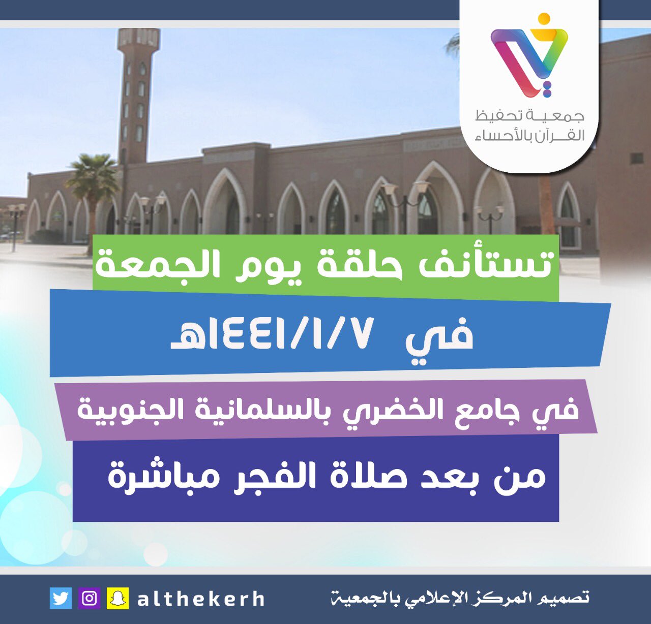 جمعية خير Auf Twitter الجمعة 1441 1 17هـ تستأنف حلقة يوم الجمعة في جامع الخضري بالسلمانية الجنوبية من بعد صلاة الفجر إلى الساعة 10 30 صباحا الأحساء المنطقة الشرقية Https T Co Tqyyhcmcuc