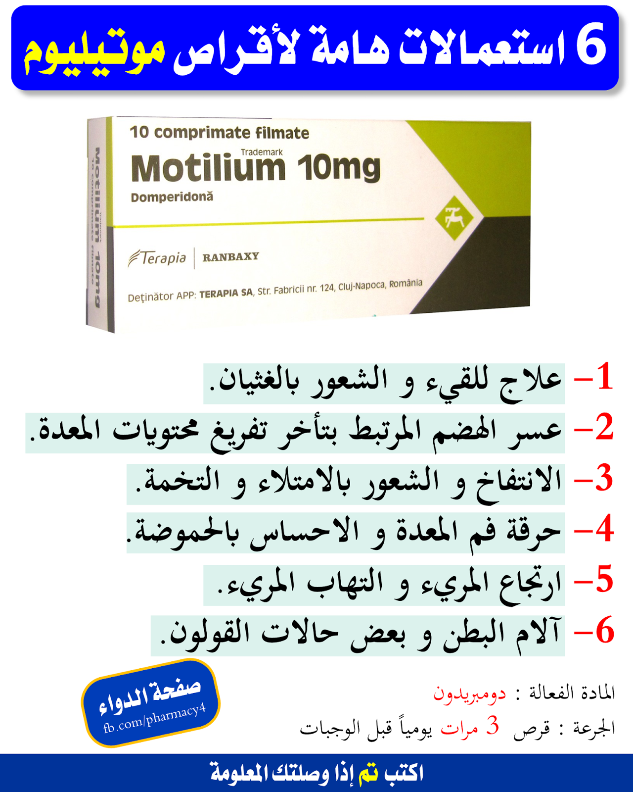 صفحة الدواء أقراص موتيليم للقيء و ارتجاع المريء مادتها الفعالة دومبريدون Motilium
